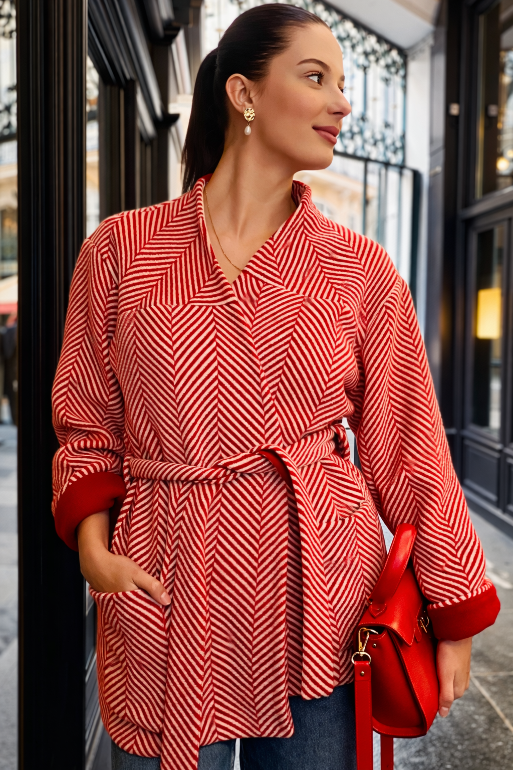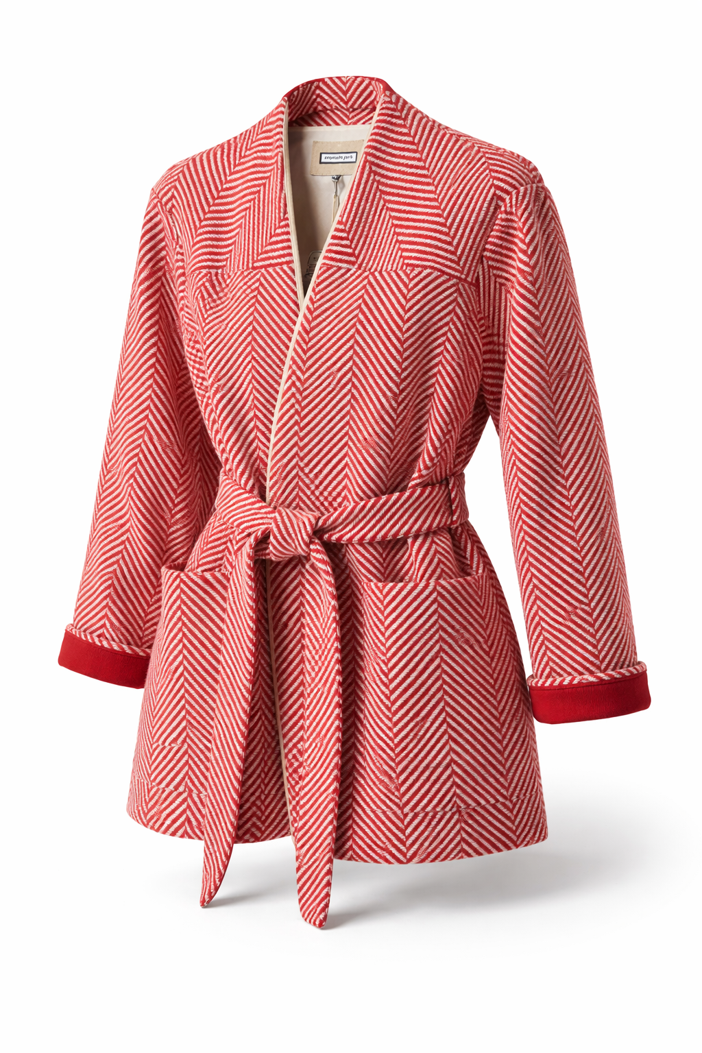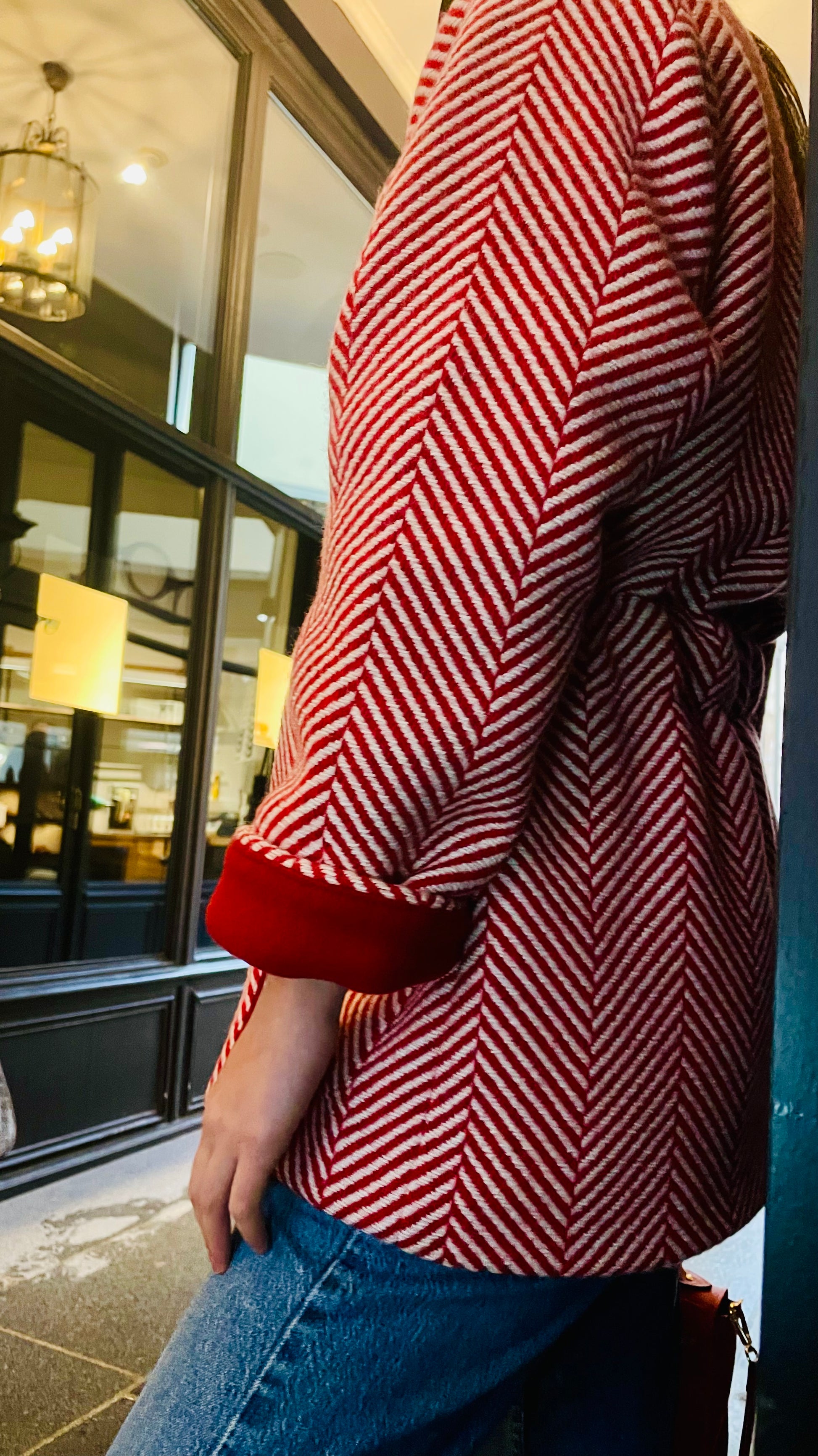 Veste Kimono — Tweed Chevron Rouge & Écru