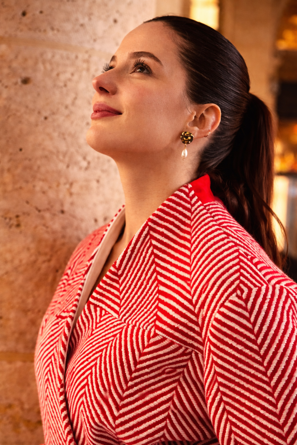 Confectionnée en tweed 100% laine, issu des sur-stocks de grandes maisons françaises et italiennes, cette veste révèle un motif chevron rouge et blanc d’une intensité maîtrisée. Le dessin graphique allonge la silhouette, tandis que la coupe croisée, sans col marqué, évoque une ligne pure et contemporaine.